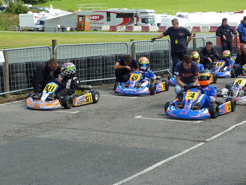 The fifth round of the Super One National Championship for 2010 was held at the Dragon Kart Club at the circuit called Glan Y Gors in North Wales. The circuit lies on the A5 between Corwen and Betws-y-Coed, just outside the village of Cerrigydrudion. This is one of my favourite circuits due to the challenging nature of the track, with rises and falls and testing corners by the fact that the circuit is positioned on a hillside. We set off from Prestwood on Thursday evening and eventually arrived at the circuit very late on Thursday night. I was using the Kart Tek Zip Storm chassis again during this meeting and testing on Friday went very well, with my best time in the top three places. Saturday August 7th ~ as usual there were two test sessions in the morning at 10.00 and 10.50 and there weren't any problems. The10 min qualifying session started at midday. Thirty-one karts went out to qualify. I was drawn in the first group and obtained the fastest lap at 54.34 s, slightly slower than normal, as the track was slightly wet and we were running on wet tyres. When the two groups were combined, I was fastest overall, 0.15 s faster than Max Vaughan {Fusion Team}, who is currently second in the Championship. {See the official timed qualifying sheet below}. As a result, I started my first heat at 14.15 in pole position {see image below}. The track was still slightly wet so wet tyres were the popular choice. On the opening lap I dropped down to 4th behind Darius Karbeley, but regained 2nd place during lap 3. During Lap 8 I dropped to 9th but later regained one place to finish the race in 8th position. My fastest time of 49.66 s was fourth fastest, only 6/100th s off the fastest lap. I was disappointed, as I had started on pole but working 'alone' at the front is not easy!!! |