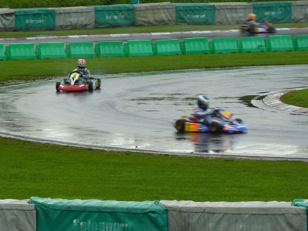 Sunday June 20th ~ after the 10 min practice, I started 1st on the grid for my second heat at 10.35. As the day before, the track was dry with the weather bright and sunny. During lap 3 I dropped to second behind Nathan Aston, but regained the lead for laps 7 and 8. I finished 2nd 8/100th s behind the winner. With two good heat results I started the first final in 2nd position. On the opening lap I lost second place to Nathan Aston, eventually finishing 3rd behind Tom Harvey and Nathan Aston; 0.30 s covered the top three drivers. My fastest time was 6/100 s off the fastest lap. I was 3rd fastest. In the Grand final I started 3rd. This was delayed to the last race of the day, as there had been a protest relating to control tyres leaving Parc Ferme after the first Final. The race started at 16.59. During lap 1 I gained second place and held this up to lap 5 when I took the lead! During lap 9 things went wrong.......... I dropped to 5th and later dropped to 7th. Maybe the tyres were beginning to 'go off' or maybe carburation adjustment was to blame. I crossed the line in 6th position, but was promoted to 5th when one of the karts in front was excluded for having a loose silencer. These results have improved my position in the Super One Championship; I'm still lying 4th with 332 points, but I have closed the gap on 3rd place by 10 points. Yet again,