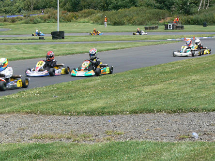 We decided to not take the long trip to Nutts Corner in Northern Ireland for Round 5 of the Super One series, as this would be counted as one of our drop scores. So Round 6 at the West of Scotland Kart Club, at the Summerlee raceway, Larkhall {see my links page} was our next round after the Super One round in July at Whilton Mill. The Larkhall circuit is just off the M74, South of Glasgow, so our trip from Prestwood was 'a fair old way'. Friday was the first day of practice and I was pleased with my best time of 44.54 s, as this was my first time at the circuit. The best time of the day was 44.48 s, my time putting me second overall. I was driving my old Zip Blade chassis throughout the weekend. Saturday September 12 th ~ After two practice sessions in the morning, timed qualifying took place. During the session, I spun off the circuit and as a result, I rejoined not obtaining a tow from other competitors. This is very important to get that extra speed and thus a faster time. After the 10 min qualifying session, I was 13th fastest, 0.34 s down on the fastest time. I was disappointed as you can imagine. In Heat 1, I started 13th and got a reasonable start and eventually got to 7th place, working in a group of 5 karts. On the last lap, whilst trying to overtake, I went wide and lost two places to finish 9th. Sunday September