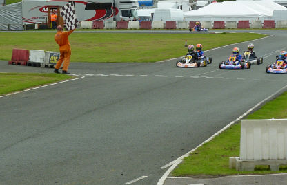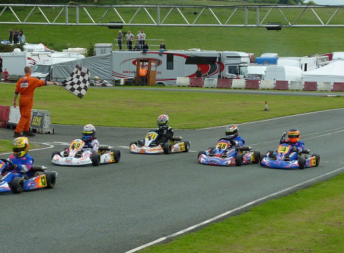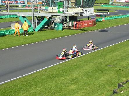 that were generally either the quickest or in the top three. Saturday May 29th ~ there were two test sessions in the morning and a 10 min qualifying session starting at around midday. Thirty karts went out to qualify. I was drawn in the second group and obtained the fastest lap at 55.35 s. This was 0.7s faster than the next driver. Not bad, as I had never been to the circuit before. When the two groups were combined, I was 2nd fastest overall, only beaten by Nathan Aston who had a time of 55.27 s {0.08s faster than my best}. I started my first heat in 2nd position on the outside of the track for the first bend. Unfortunately I was pushed off onto the grass on the opening lap to end up in 11th position at the end of lap 1. I then climbed back through the field to finish 3rd, 0.94 s behind the winner. I obtained the fastest lap at 55.11 s. In my second heat, later in the day, I again started 2nd on the grid and finished 3rd with a time of 53.43 s. This was 0.53 s off the fastest lap, so I was a little disappointed. The race itself was a 'bit messy', with me taking the lead at one stage and then dropping to 5th on lap 5. This is an indication of how close the level of racing is at Super One ~ one mistake and you can be passed by several karts. Sunday May 30th ~ after the 10 min practice, I started 2nd on the grid for the first final at 12:50. The track was dry with the weather rather cloudy. Yet again I had a disappointing start, dropping to 8th on the opening lap. The remaining part of the race was mixed, climbing to 3rd for laps 6 to 8 and then dropping back to 9th during lap 10. I finished 5th by gaining two places on the final lap, with the 2nd = fastest time of 49.64 s, only 0.08 s off the fastest lap. In the Grand final, I started 5th and finished 6th. The highest place that I reached during the race was 4th. My fastest lap was 49.72 s, 0.17 s off the fastest lap. All in all, a pretty good meeting. I feel that I could have done better, if it had not been for the 'somewhat' poor starts. I collected two trophies at the meeting; these were presented by the 2009 British Touring Car Champion {BTCC}, Colin Turkington. Colin comes from Northern Ireland. These results have improved my position in the Super One Championship; I'm now currently lying 4th with 233 points, 31 points behind 3rd position. Yet again, a big 'thank you' to Kart Tek and of course Dad. |