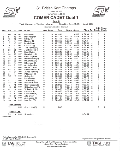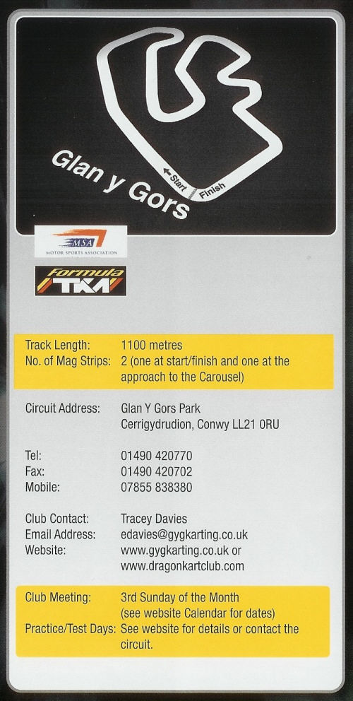 The fifth round of the Super One National Championship for 2010 was held at the Dragon Kart Club at the circuit called Glan Y Gors in North Wales. The circuit lies on the A5 between Corwen and Betws-y-Coed, just outside the village of Cerrigydrudion. This is one of my favourite circuits due to the challenging nature of the track, with rises and falls and testing corners by the fact that the circuit is positioned on a hillside. We set off from Prestwood on Thursday evening and eventually arrived at the circuit very late on Thursday night. I was using the Kart Tek Zip Storm chassis again during this meeting and testing on Friday went very well, with my best time in the top three places. Saturday August 7th ~ as usual there were two test sessions in the morning at 10.00 and 10.50 and there weren't any problems. The10 min qualifying session started at midday. Thirty-one karts went out to qualify. I was drawn in the first group and obtained the fastest lap at 54.34 s, slightly slower than normal, as the track was slightly wet and we were running on wet tyres. When the two groups were combined, I was fastest overall, 0.15 s faster than Max Vaughan {Fusion Team}, who is currently second in the Championship. {See the official timed qualifying sheet below}. As a result, I started my first heat at 14.15 in pole position {see image below}. The track was still slightly wet so wet tyres were the popular choice. On the opening lap I dropped down to 4th behind Darius Karbeley, but regained 2nd place during lap 3. During Lap 8 I dropped to 9th but later regained one place to finish the race in 8th position. My fastest time of 49.66 s was fourth fastest, only 6/100th s off the fastest lap. I was disappointed, as I had started on pole but working 'alone' at the front is not easy!!! |