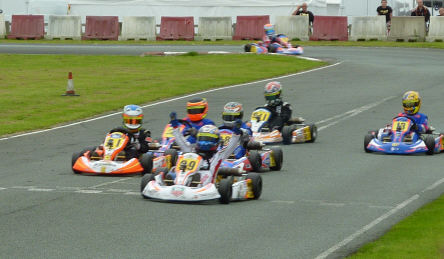 Sunday June 20th ~ after the 10 min practice, I started 1st on the grid for my second heat at 10.35. As the day before, the track was dry with the weather bright and sunny. During lap 3 I dropped to second behind Nathan Aston, but regained the lead for laps 7 and 8. I finished 2nd 8/100th s behind the winner. With two good heat results I started the first final in 2nd position. On the opening lap I lost second place to Nathan Aston, eventually finishing 3rd behind Tom Harvey and Nathan Aston; 0.30 s covered the top three drivers. My fastest time was 6/100 s off the fastest lap. I was 3rd fastest. In the Grand final I started 3rd. This was delayed to the last race of the day, as there had been a protest relating to control tyres leaving Parc Ferme after the first Final. The race started at 16.59. During lap 1 I gained second place and held this up to lap 5 when I took the lead! During lap 9 things went wrong.......... I dropped to 5th and later dropped to 7th. Maybe the tyres were beginning to 'go off' or maybe carburation adjustment was to blame. I crossed the line in 6th position, but was promoted to 5th when one of the karts in front was excluded for having a loose silencer. These results have improved my position in the Super One Championship; I'm still lying 4th with 332 points, but I have closed the gap on 3rd place by 10 points. Yet again,